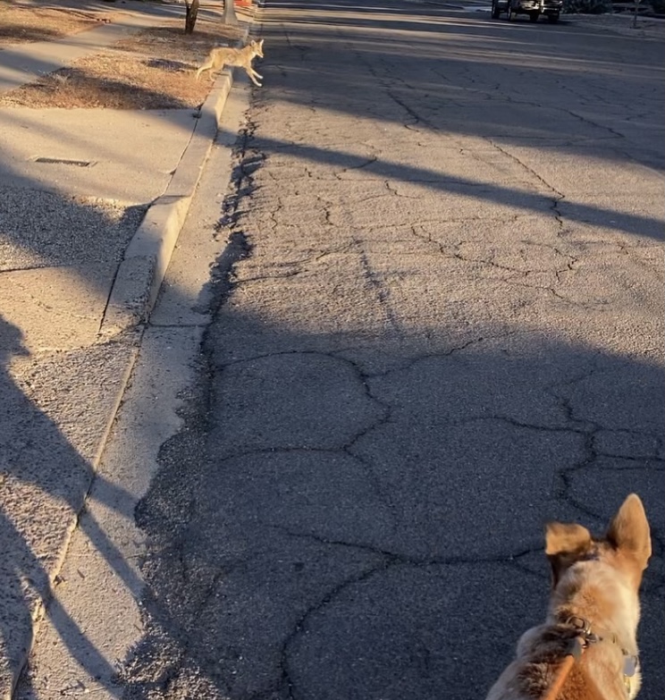 This is from the other day, when we were out walking at about 5pm… And George decided she wanted to follow a coyote we ran into over on the next block. It was traveling alone – but likely lives in the wash behind one of the streets. She barked at the thing for two blocks, stalking it. Every few houses, it would look back at us… And see me pulling back a barking and aggressive George trying to chase it more liberally.